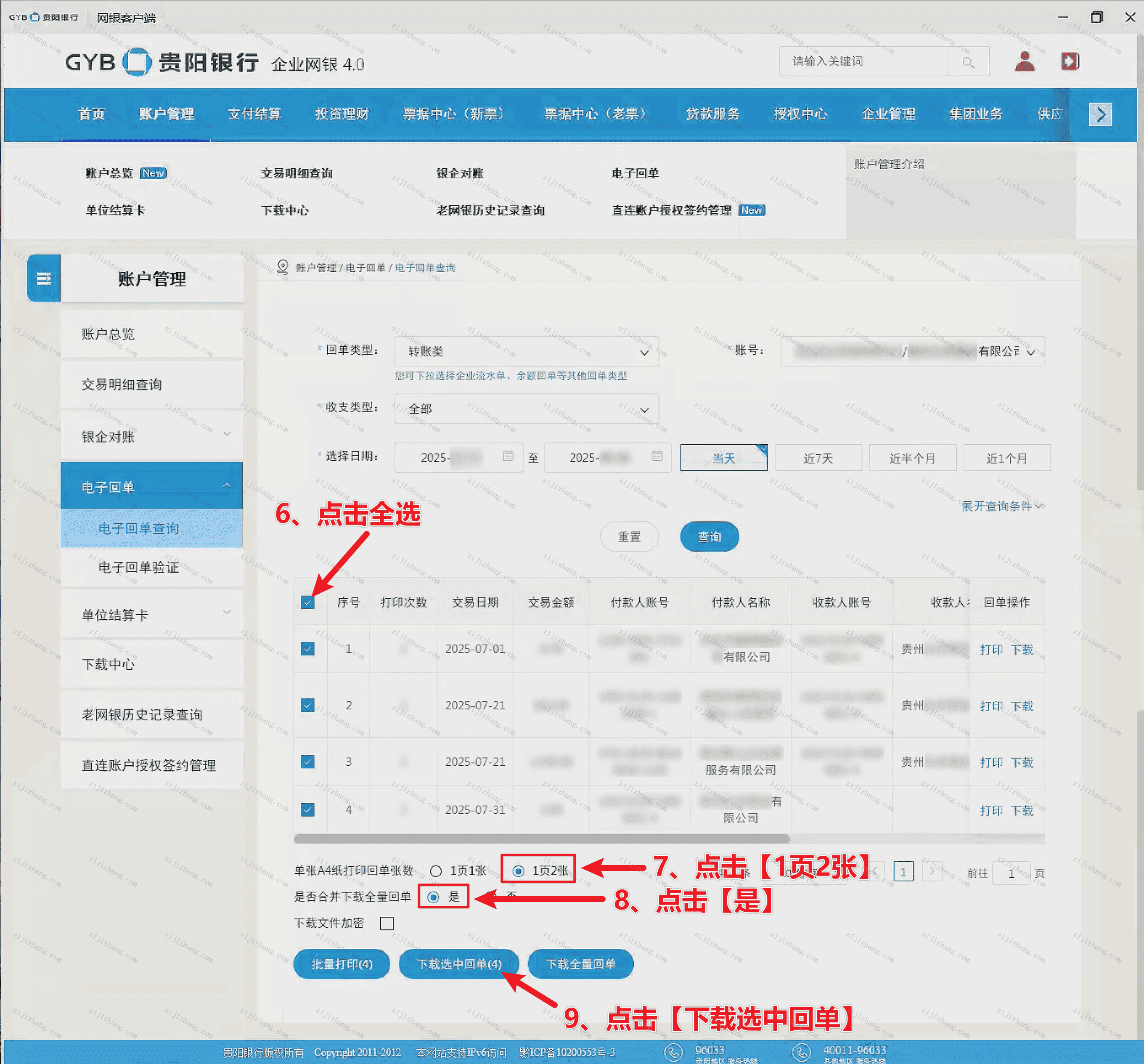 第三步:出现结果后,点击【全选】,按下图数字7、8选择点击,即可点击【下载选中回单】,选择好需要电脑保存路径后,点击保存即完成银行回单导出下载(对应下图数字6-9步骤)