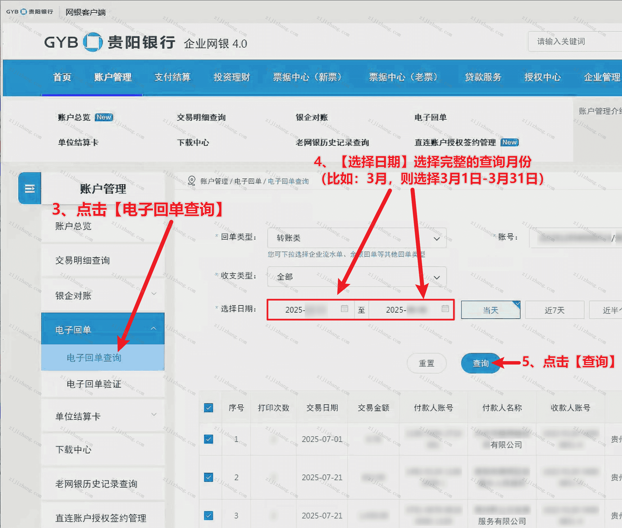 第二步:点击页面左侧的【电子回单查询】,然后【选择日期】,选择完整的查询月份(比如:3月,则选择3月1日-3月31日),选择好了即可点击【查询】(对应下图数字3-5步骤)