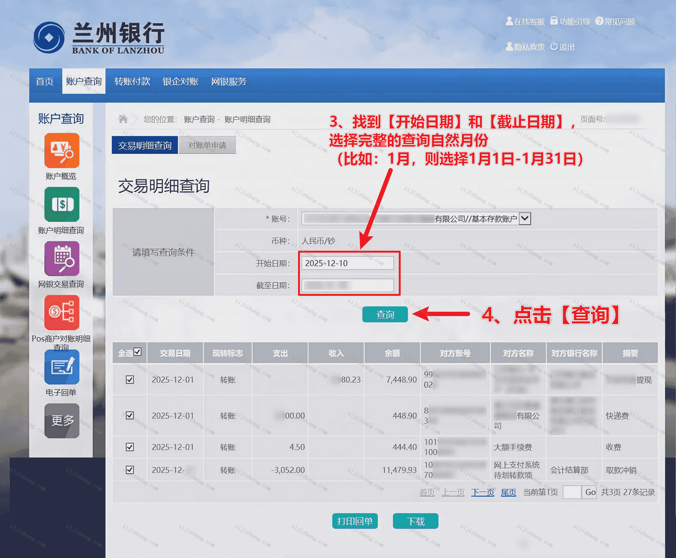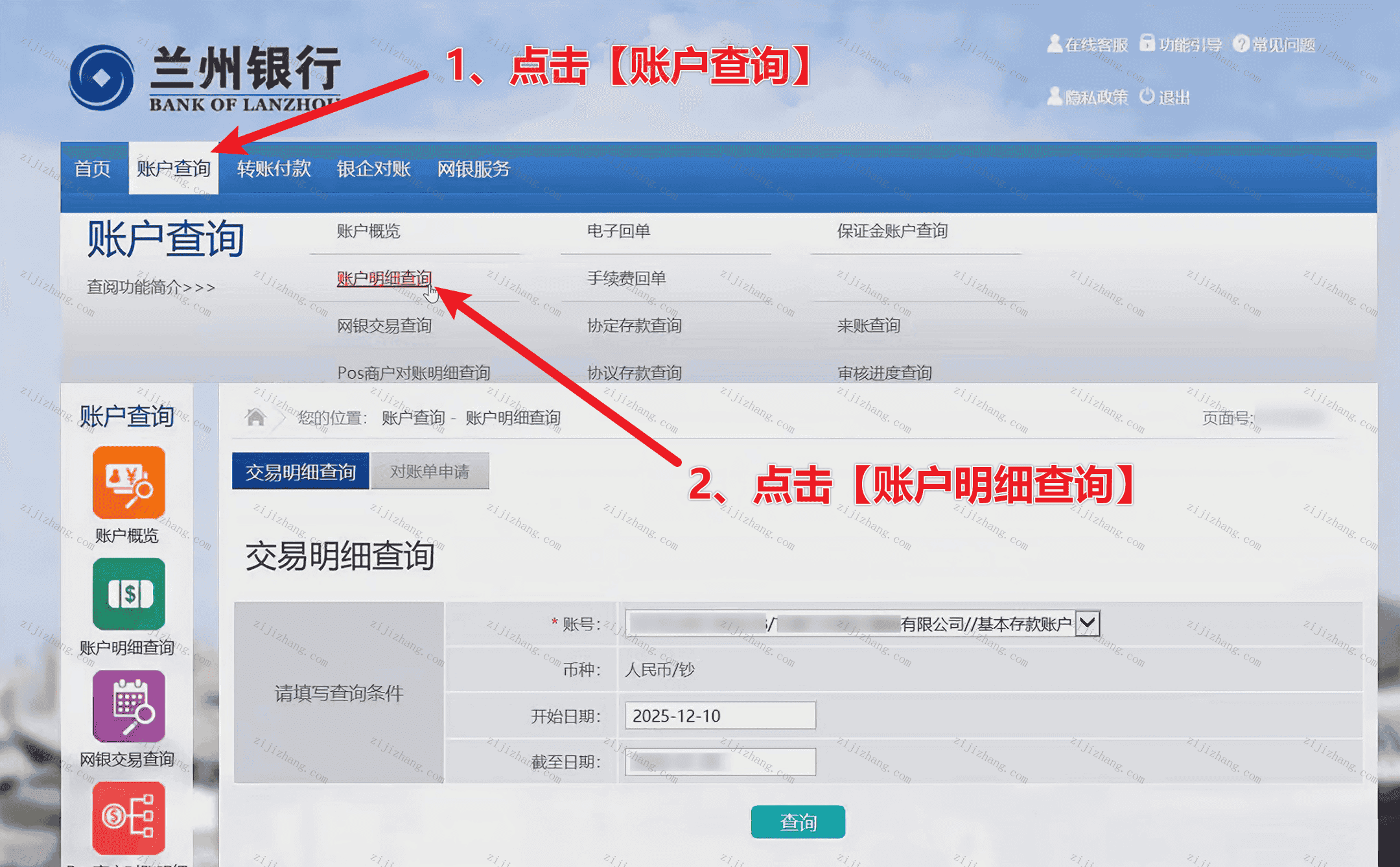 第一步:登录兰州银行(网页端),点击【账户查询】-【账户明细查询】(对应下图数字1-2步骤)