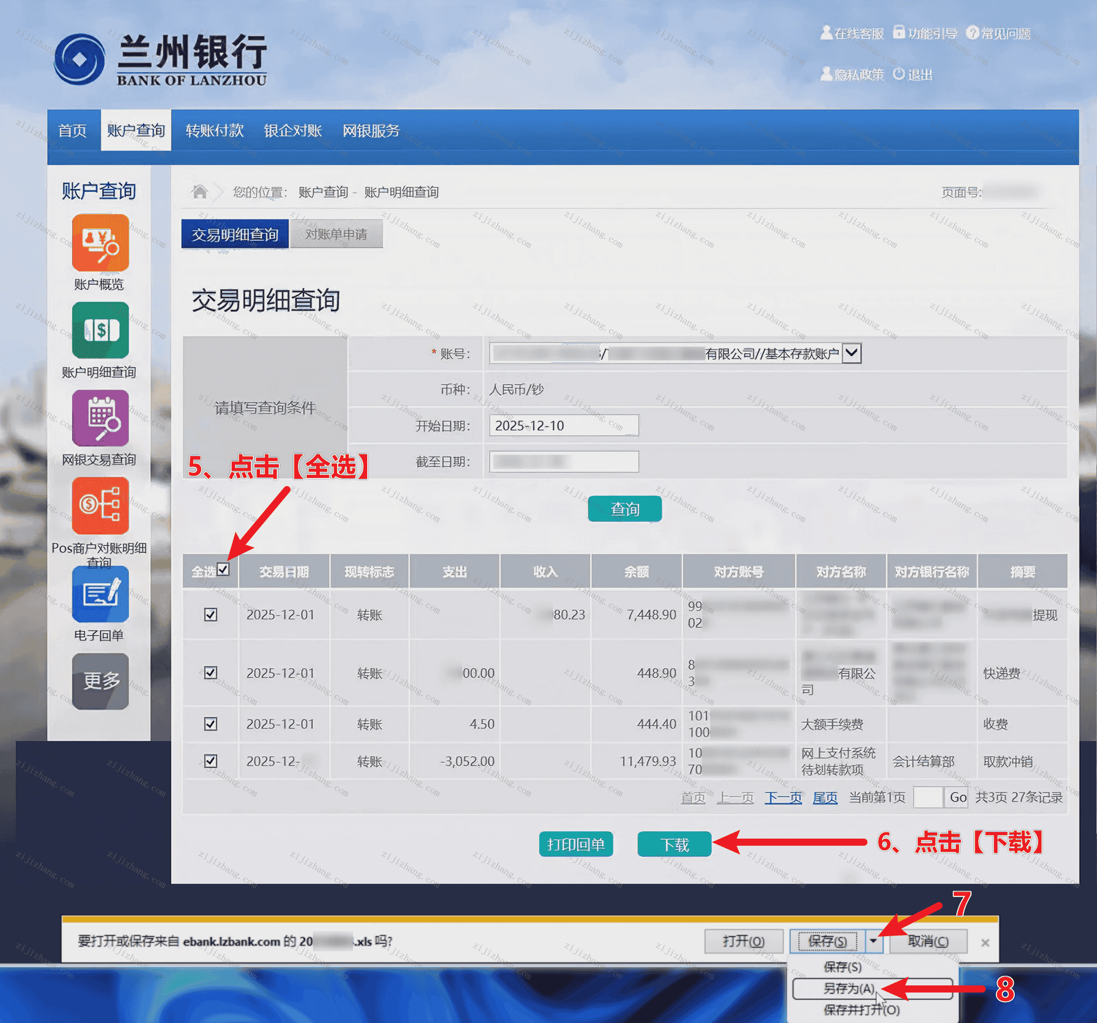第三步:点击【全选】框格按钮,点击【下载】,下方点击【保存】右侧箭头,点击【另存为】,建议您选择保存路径为桌面,便于您稍后上传(对应下图数字5-8步骤)